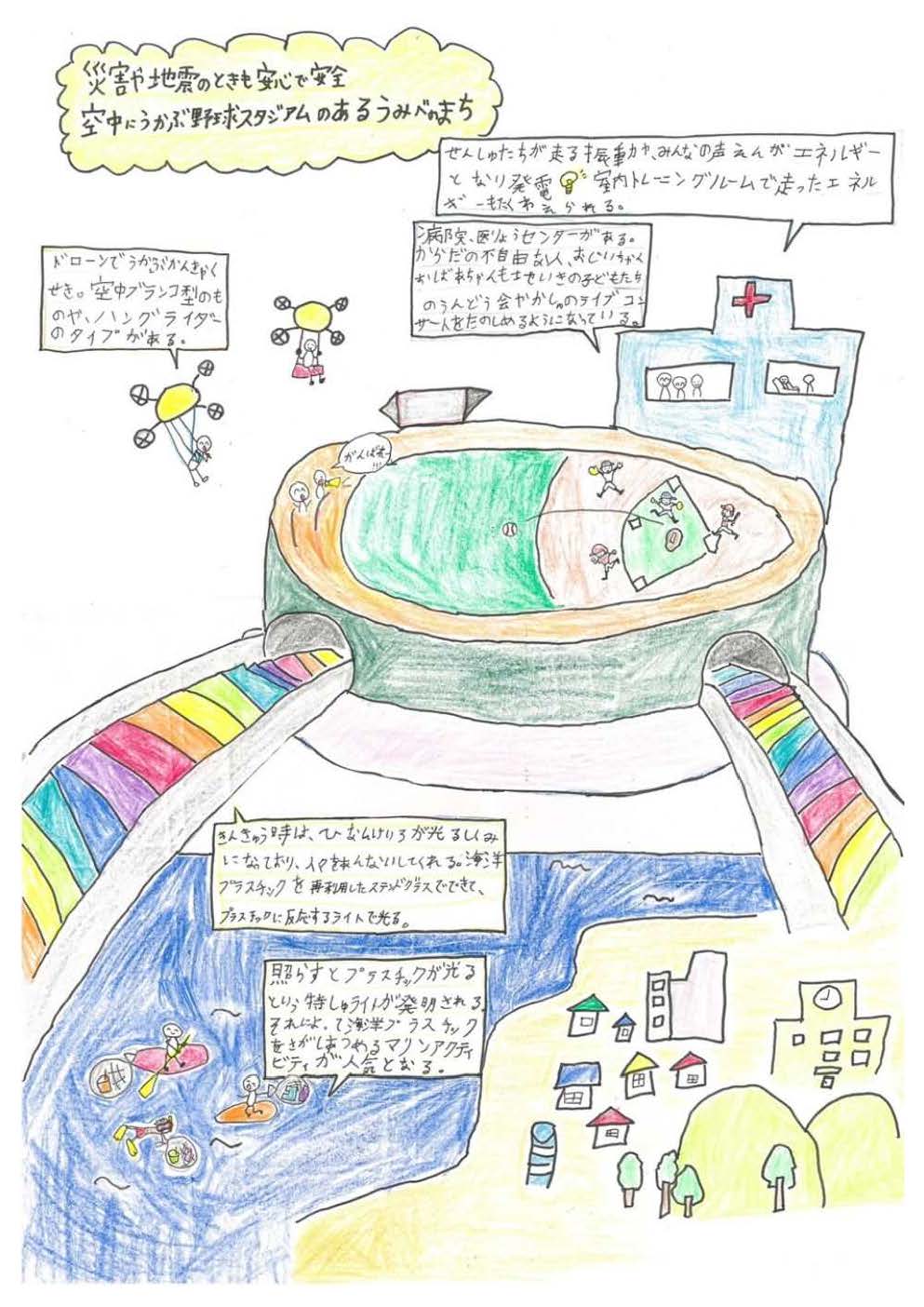 倉知 稜英 さん(千葉県) 災害や地震のときも安心で安全  空中にうかぶ野球スタジアムのあるうみべのまち