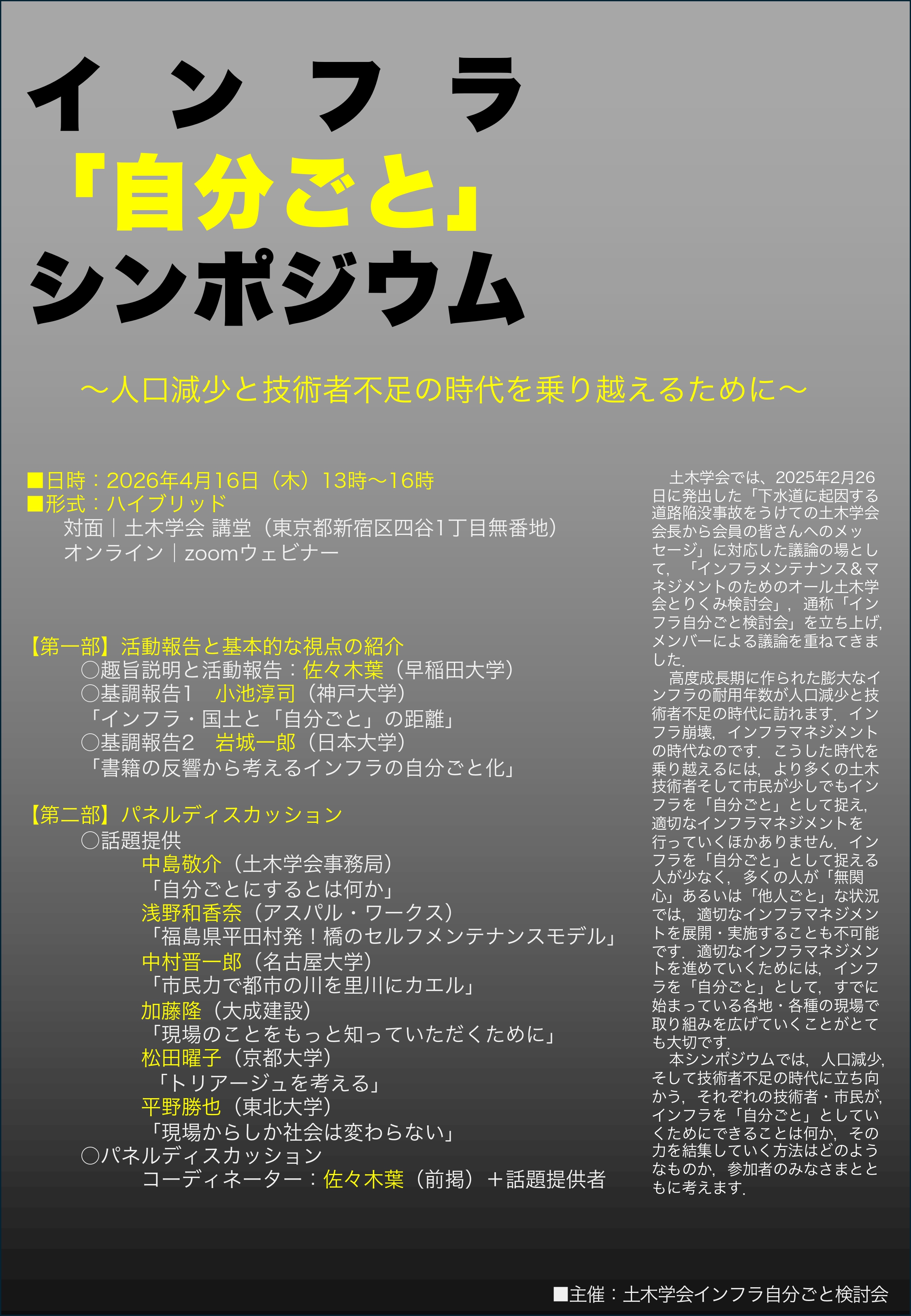本シンポジウムでは,人口減少,そして技術者不足の時代に立ち向かう,それぞれの技術者・市民が,インフラを「自分ごと」としていくためにできることは何か,その力を結集していく方法はどのようなものか,参加者のみなさまとともに考えます.